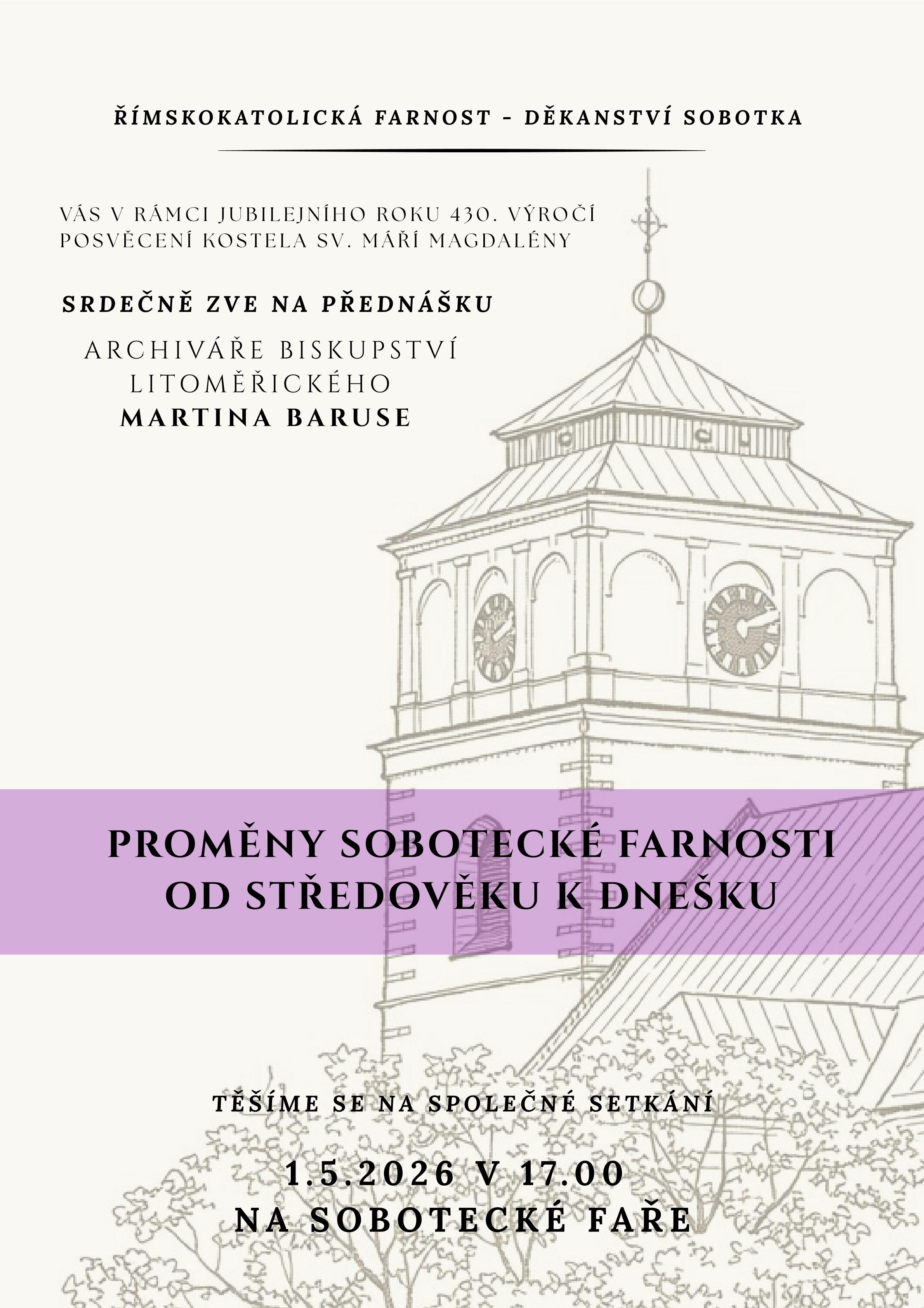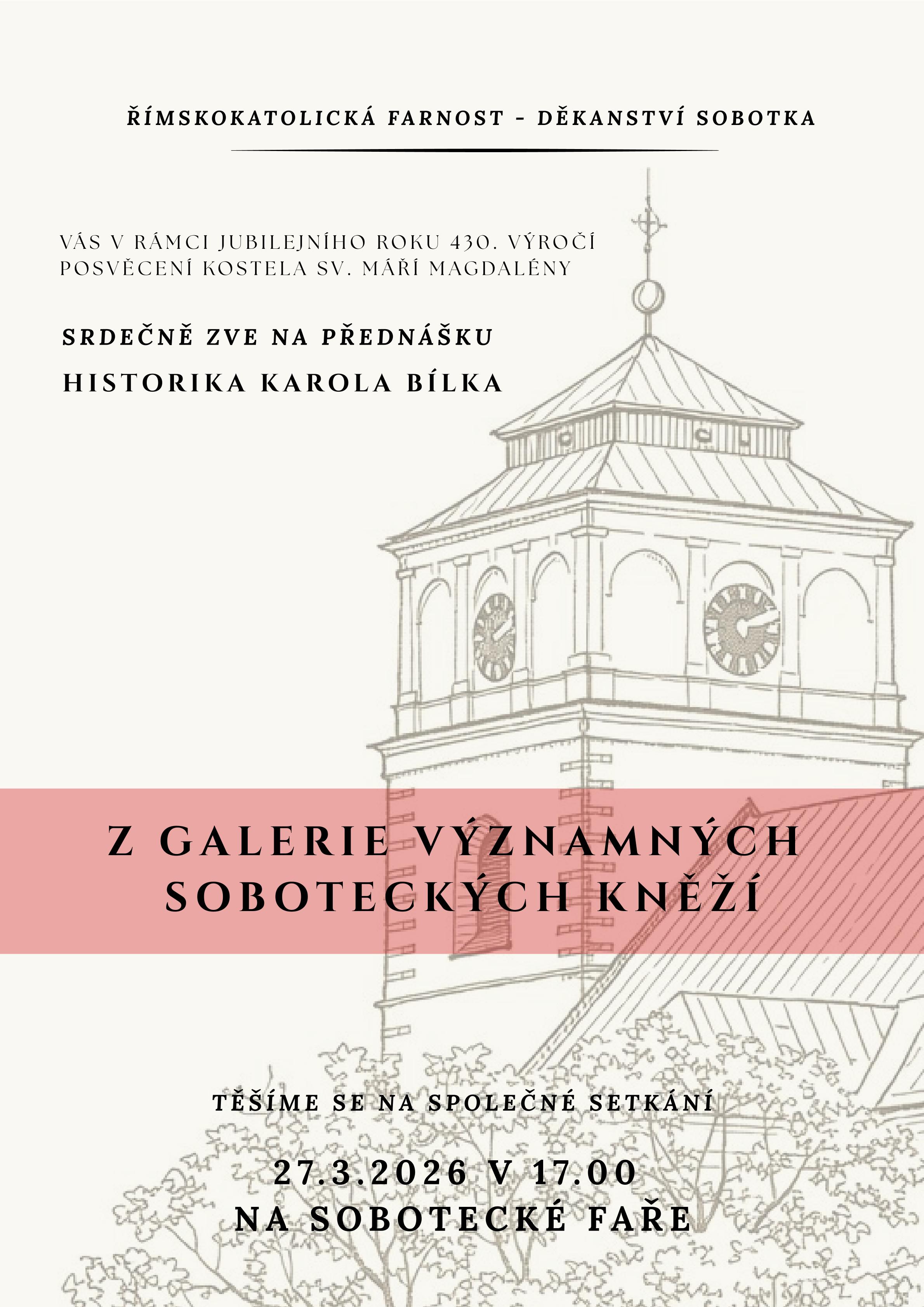 Zveme na přednášku Karola Bílka o významných soboteckých kněžích. Jedná se o první přednášku z cyklu, který připravujeme k 430. výročí posvěcení kostela sv. Máří Magdalény.